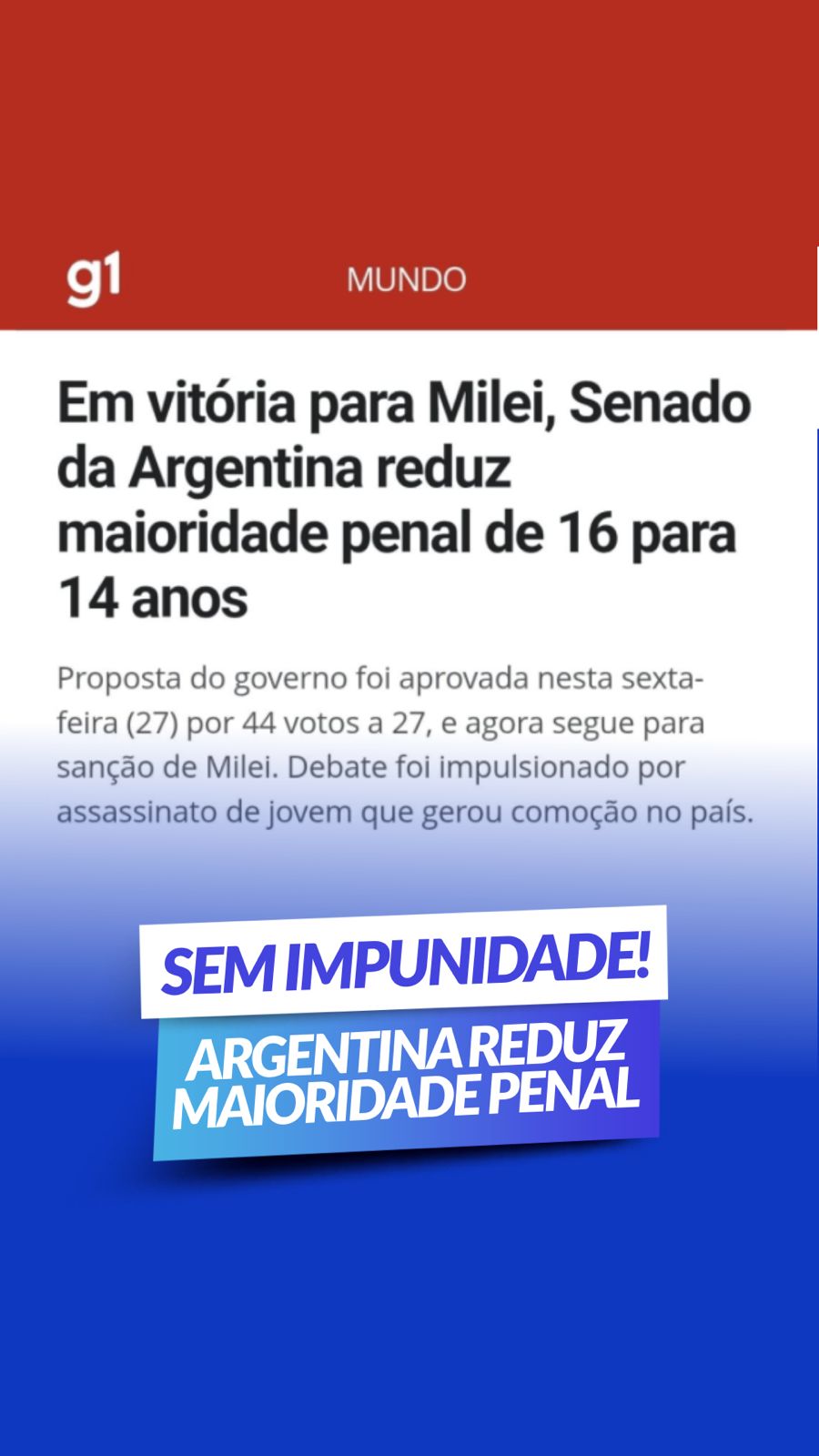 O secretário de Governo do Estado do Rio de Janeiro e pré-candidato ao Senado por Sergipe, André Moura, defendeu, mais uma vez em suas redes sociais, a redução da maioridade penal, usando a Argentina, que votará nesta sexta-feira, 27, a proposta, como referência direta. Segundo ele, “Mesmo com uma taxa de homicídios quatro vezes menor que a do Brasil, o país vizinho aprovou recentemente na Câmara dos Deputados a redução da maioridade de 16 para 14 anos, sob apoio do presidente Javier Milei”.