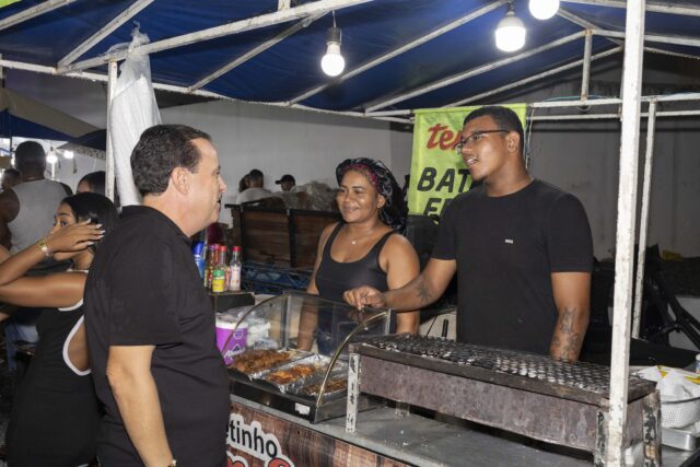 Durante a passagem pelo evento, André consumiu produtos de vendedores ambulantes do bairro — gesto visto como valorização do comércio popular e de conexão com o cotidiano das pessoas.